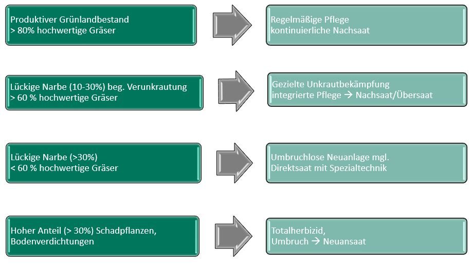 Bei der Auswahl der Gräsermischung sollte auf die Standorteignung und die Nutzungsrichtung der Mischung geachtet werden. Abhängig vom Anteil hochwertiger Gräser empfiehlt sich eine Nachsaat bzw. Neuansaat.